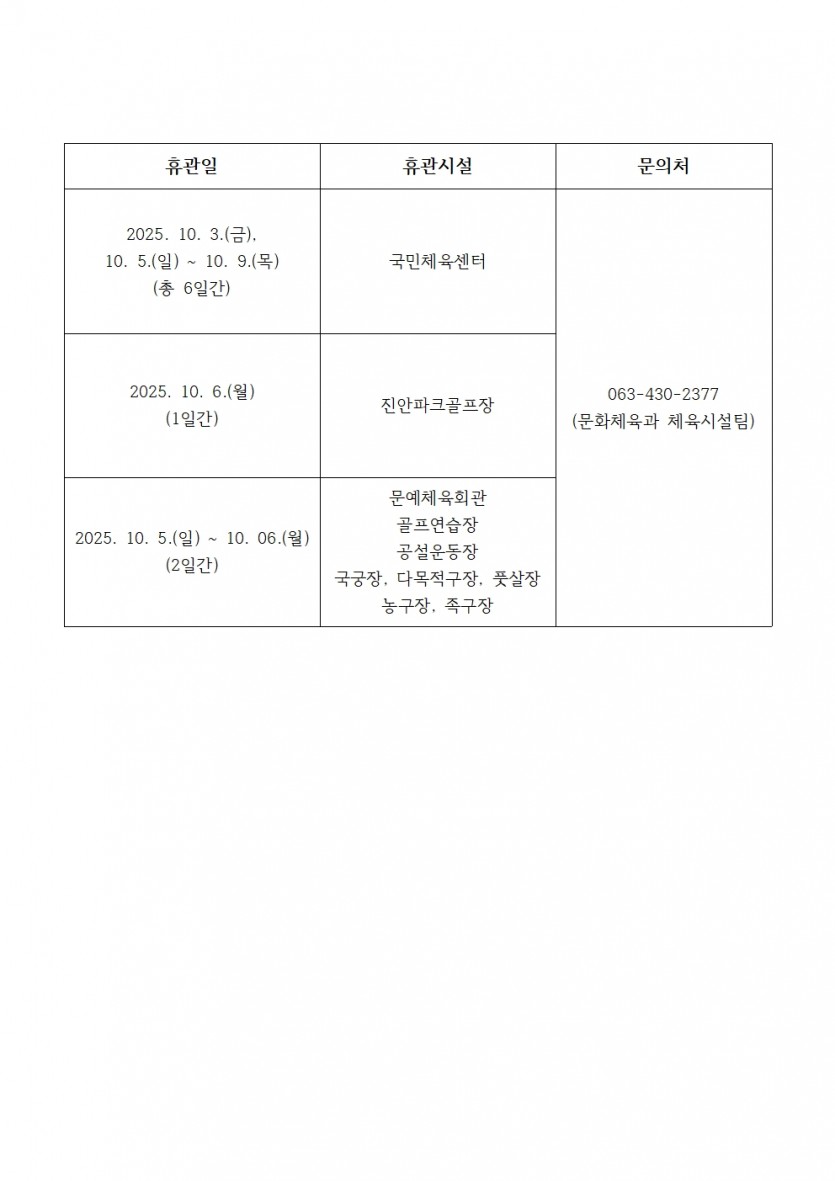 추석 연휴 진안군 공공체육시설 휴관 알림 페이지 정보 작성자 관리자 댓글 0건 조회 112회 작성일 25-09-25 09:30 목록 본문 다음글전민일보배 파크골프 대회 대진표 25.09.09